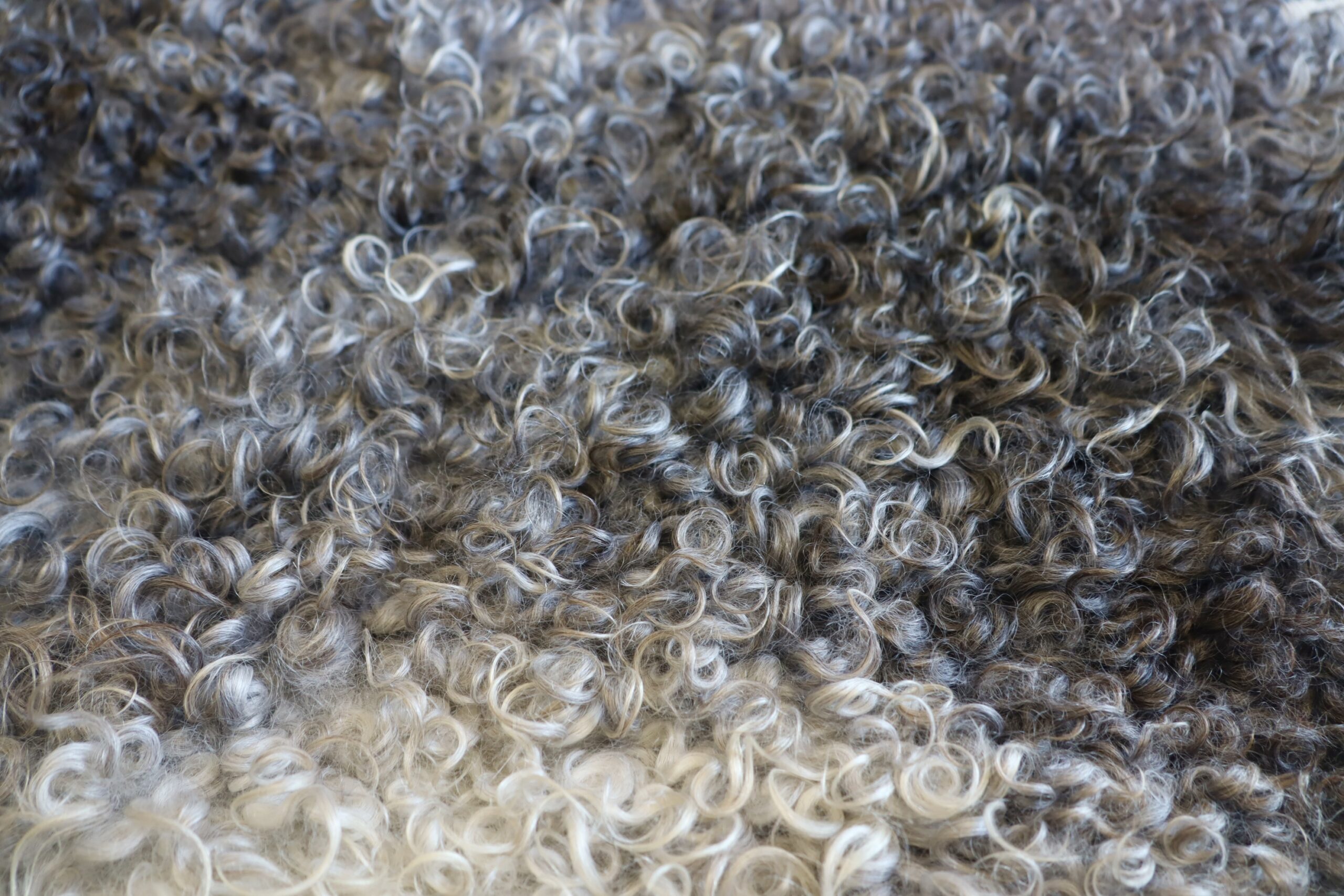 This is a large Gotland sheepskin with a very thick coat, with a distinct colouration fade from cream to dark grey — 100% Natural colouration as always.